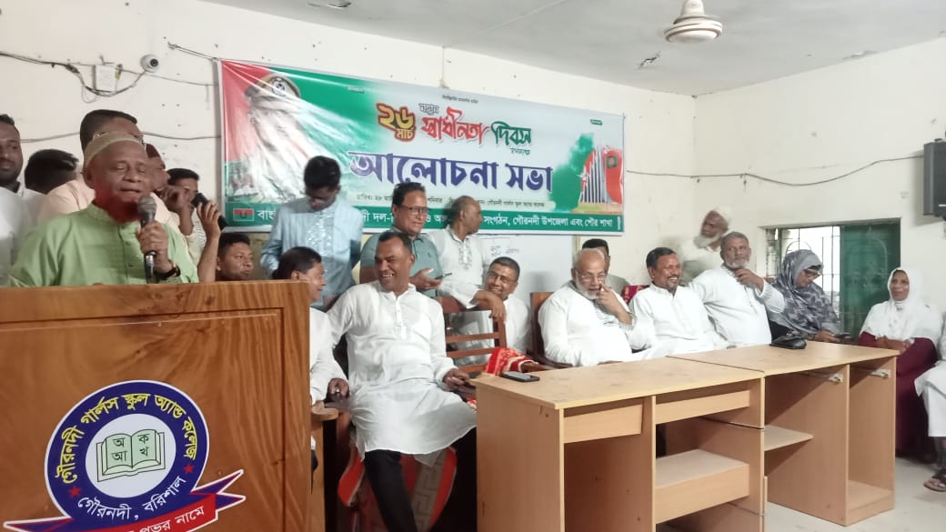 মহান স্বাধীনতা ও জাতীয় দিবস উপলক্ষে শনিবার বিকেলে বরিশালের গৌরনদীতে স্থানীয় বিএনপি ও এর অঙ্গ এবং সহযোগী সংগঠনের উদ্যোগে আলোচনা সভা অনুষ্ঠিত হয়েছে। এ উপলক্ষে বাংলাদেশ জাতীয়তাবাদী দল (বিএনপি) গৌরনদী উপজেলা, পৌর শাখা ও এর অঙ্গ এবং সহযোগী সংগঠনের ওইদিন বিকেল ৪টায় গৌরনদী গার্লস স্কুল এন্ড কলেজ মিলনায়তনে মহান স্বাধীনতা দিবসের তাৎপর্য তুলে ধরে এক আলোচনা সভা অনুষ্ঠিত হয়। গৌরনদী উপজেলা বিএনপির সভাপতি সৈয়দ সরোয়ার আলম বিপ্লবের সভাপতিত্বে অনুষ্ঠিত ওই আলোচনা সভায় প্রধান অতিথি হিসেবে উপস্থিত ছিলেন বরিশাল উত্তর জেলা বিএনপি’র সদস্য সচিব মিজানুর রহমান খান মুকুল।