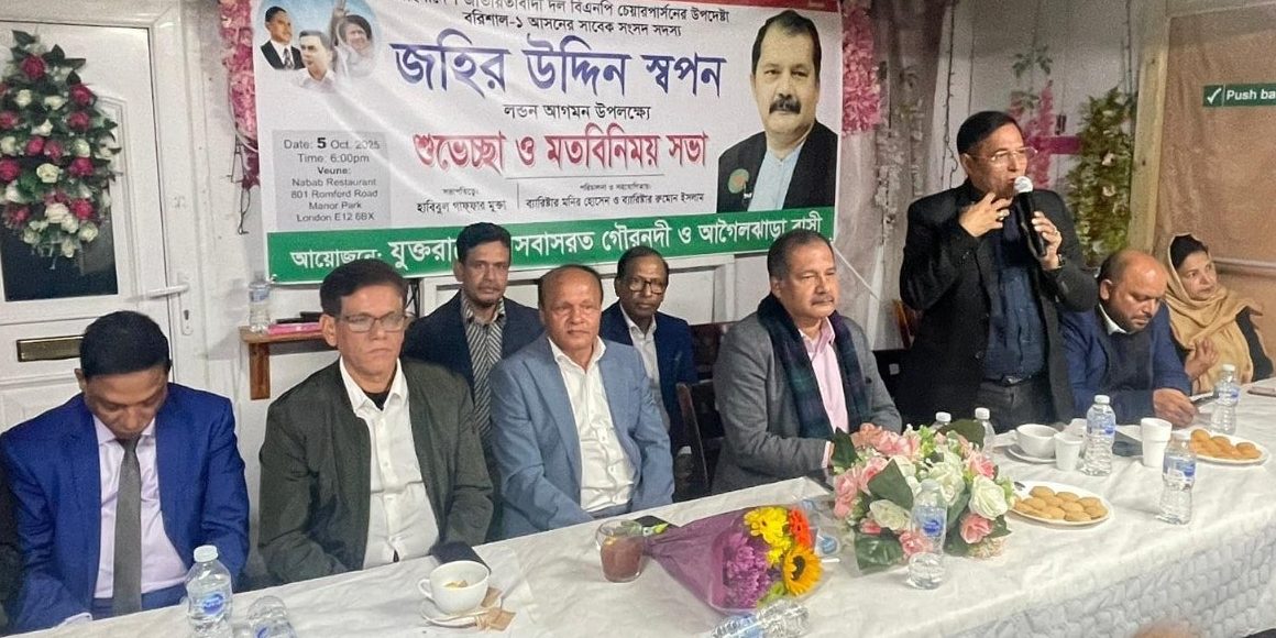 যুক্তরাজ্যের লন্ডনে গৌরনদী ও আগৈলঝাড়ার প্রবাসী বাংলাদেশিদের আয়োজিত এক শুভেচ্ছা বিনিময় অনুষ্ঠানে প্রাণঢালা ভালোবাসায় সিক্ত হয়েছেন বাংলাদেশ জাতীয়তাবাদী দল (বিএনপি)’র কেন্দ্রীয় নেতা , সাবেক সংসদ সদস্য এবং সাবেক প্রধান মন্ত্রী খালেদা জিয়ার উপদেষ্টা ও প্রবাসীবান্ধব রাজনীতিক জননেতা জহির উদ্দিন স্বপন।