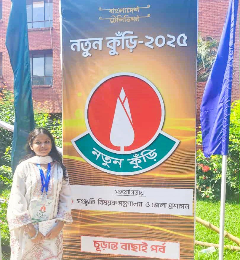 সারা দেশব্যাপী শিশু কিশোরদের প্রতিভা অন্বেষন প্রতিযোগীতা নতুন কুঁড়ি-২০২৫ প্রতিযোগীতার চুরান্ত বাচাই পর্বে সেরা দশে এর মধ্যে দ্বিতীয় স্থান লাভ করেছে বরিশালের গৌরনদীর মেয়ে প্রিয়ন্তী পোদ্দার। এর আগে রবীন্দ্র সংগীত ও দেশাত্মবোধক গানে বরিশাল বিভাগীয় পর্যায়ে উর্ত্তিন হয়।